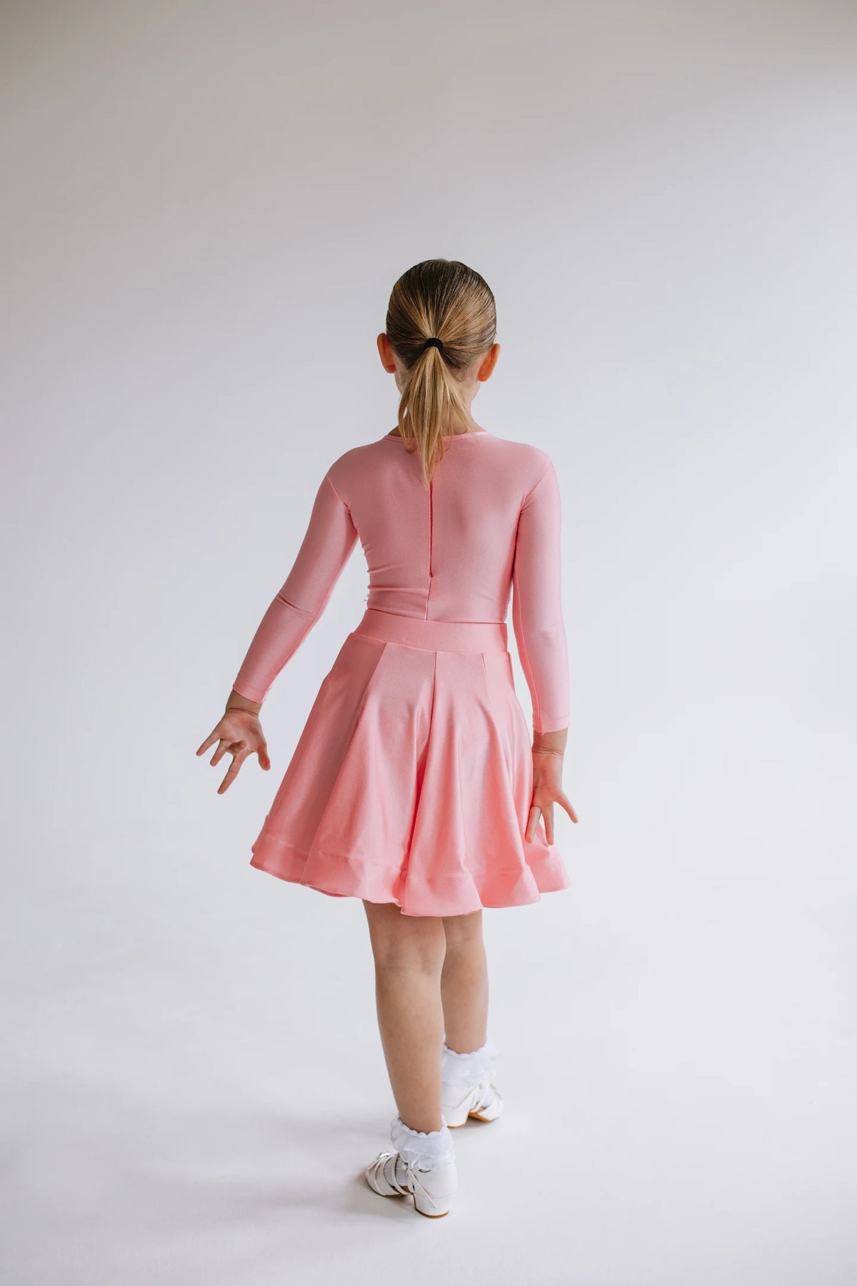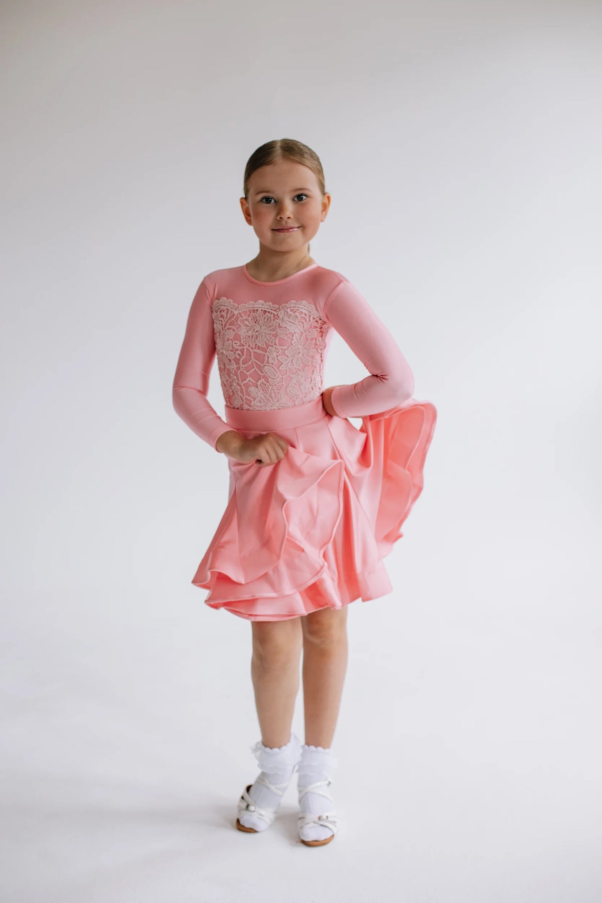 Zartes Kinder-Tanzkleid in elegantem Rosa mit floraler Spitzenapplikation auf dem Oberteil. Die langen Ärmel und der fließende, doppellagige Rock sorgen für eine stilvolle und harmonische Silhouette. Der weiche Lycra-Stoff bietet hohen Tragekomfort und volle Bewegungsfreiheit auf der Tanzfläche.